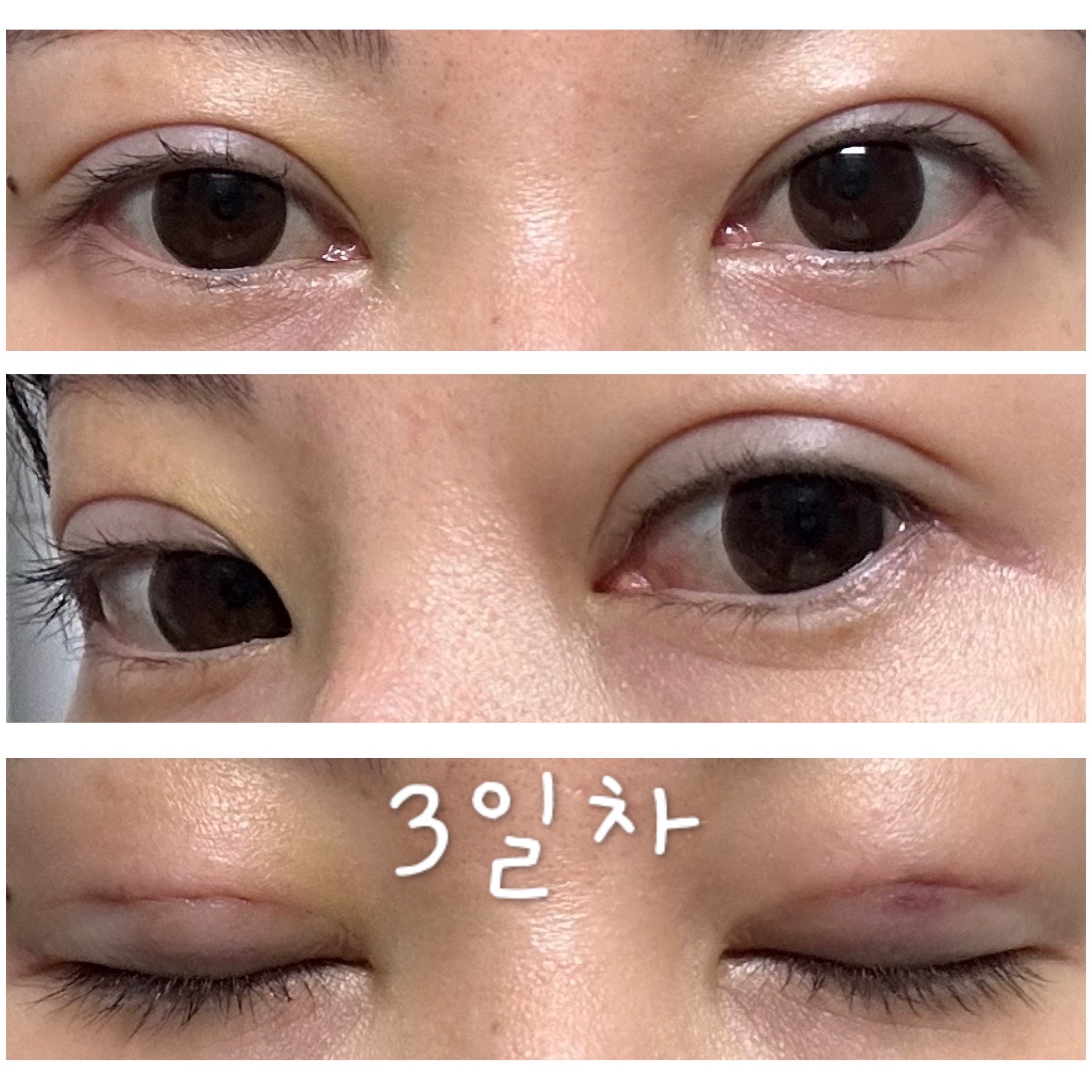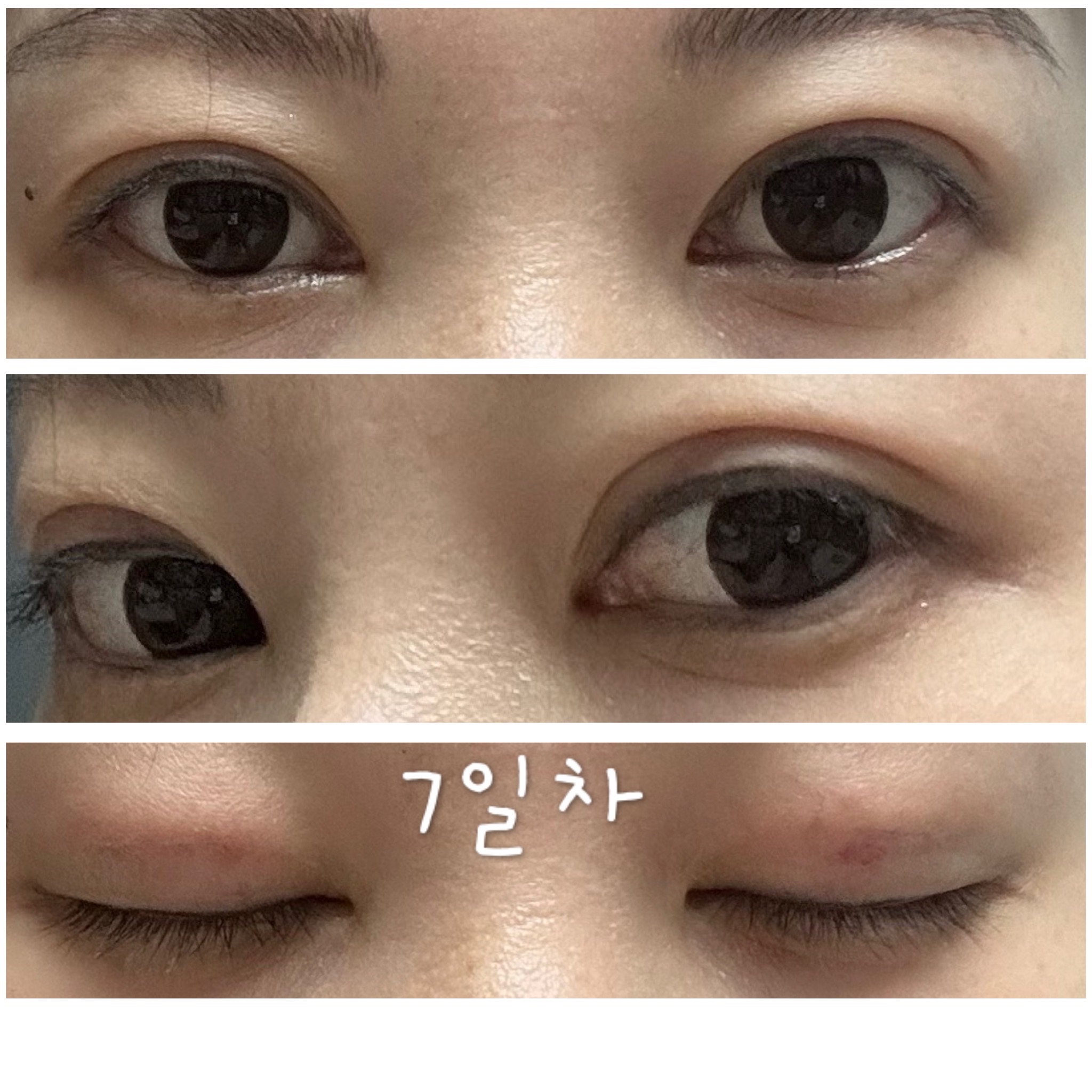 수술실까지 렌즈를 모르고 끼고있었는데 선생님들께서 도와주셔서 무사히? 렌즈를 빼고 수술이 시작되었습니다. 수술시간은 15분 정도로 짧았고 원장님께서 수술이 잘 되었는지 한번 더 확인해주신 후 마취가 깰때까지 쉬고 집에 지하철 타고 왔습니다. 택시 탈 정도로 힘들진 않았어요(평소에 렌즈를 껴서 모자와 안경 미리 챙김) 막 아프진 않았고 살짝 당기는 느낌이었습니다. 돌출눈이라 그런지 눈의 붓기가 잘 가라앉진 않아서 사람들이 알아보긴 했어요 ㅋㅋㅋ 2주정도 좀 부어있다가 서서히 빠졌습니다. 3일차 때에는 눈머리쪽에 멍이 살짝 보이다가 사라졌어요. 현재는 붓기가 거의 다 빠졌고 잔붓기만 남은 것 같아요. 일단 이마에 힘을 주지 않아도 눈이 떠지고 주름도 잡히지 않고 자연스러워서 굉장히 만족한답니다!!